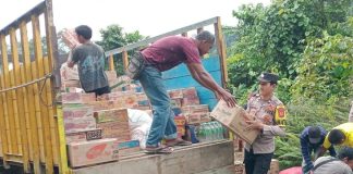 Bhabinkamtibmas Polsek Alafan Membantu Penanganan Mobil Pengangkut Sembako Terbalik