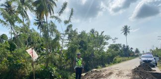Personel Sat Lantas Polres Simeulue Memastikan Jalan Sinabang-Sambay di Desa Kualaumo...