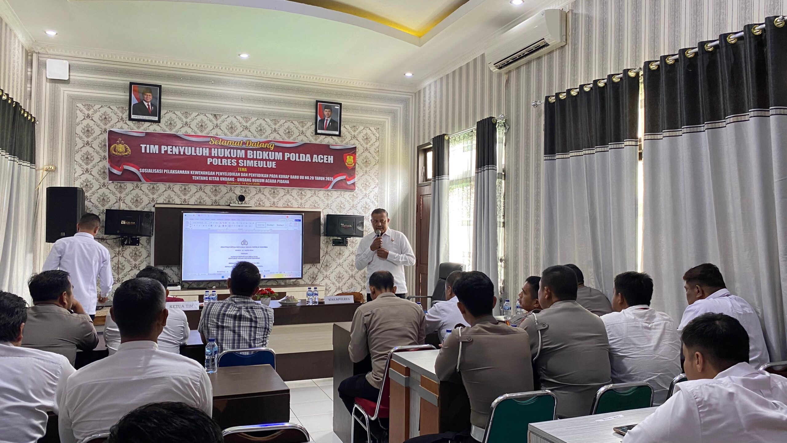 Dalam rangka meningkatkan pemahaman serta profesionalisme personel Polri terhadap perkembangan regulasi hukum acara pidana, Bidkum Polda Aceh melaksanakan kegiatan Penyuluhan dan Sosialisasi Pelaksanaan Kewenangan Penyelidikan dan Penyidikan pada KUHAP Baru, sebagaimana diatur dalam UU Nomor 20 Tahun 2025 dan UU Nomor 1 Tahun 2026, bertempat di Polres Simeulue, Selasa (14/4/2026).