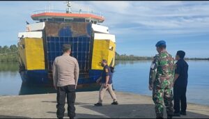 Simeulue – Personel Polres Simeulue melaksanakan kegiatan pengamanan kedatangan Kapal Motor Penumpang (KMP) Teluk Sinabang dengan rute Singkil – Sinabang pada Sabtu (27/9/2025) pagi. Pengamanan berlangsung di Pelabuhan Kolok, Kecamatan Simeulue Timur, Kabupaten Simeulue.