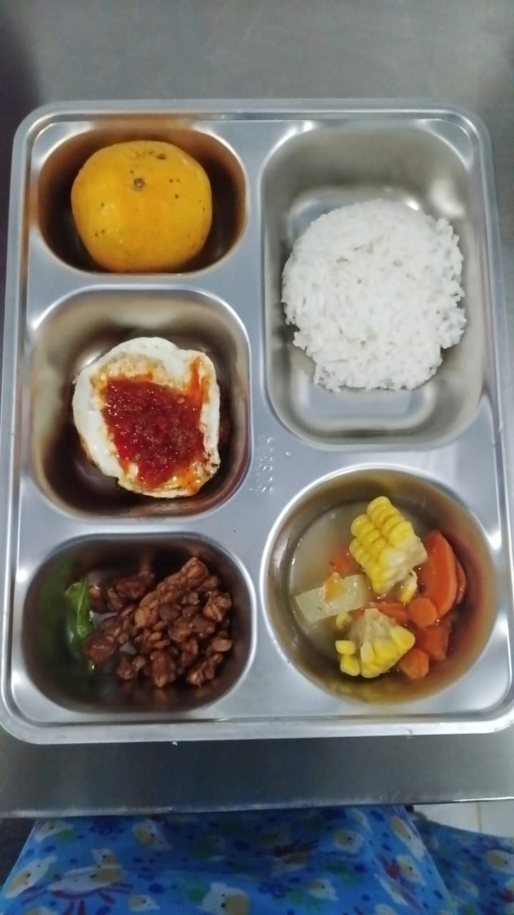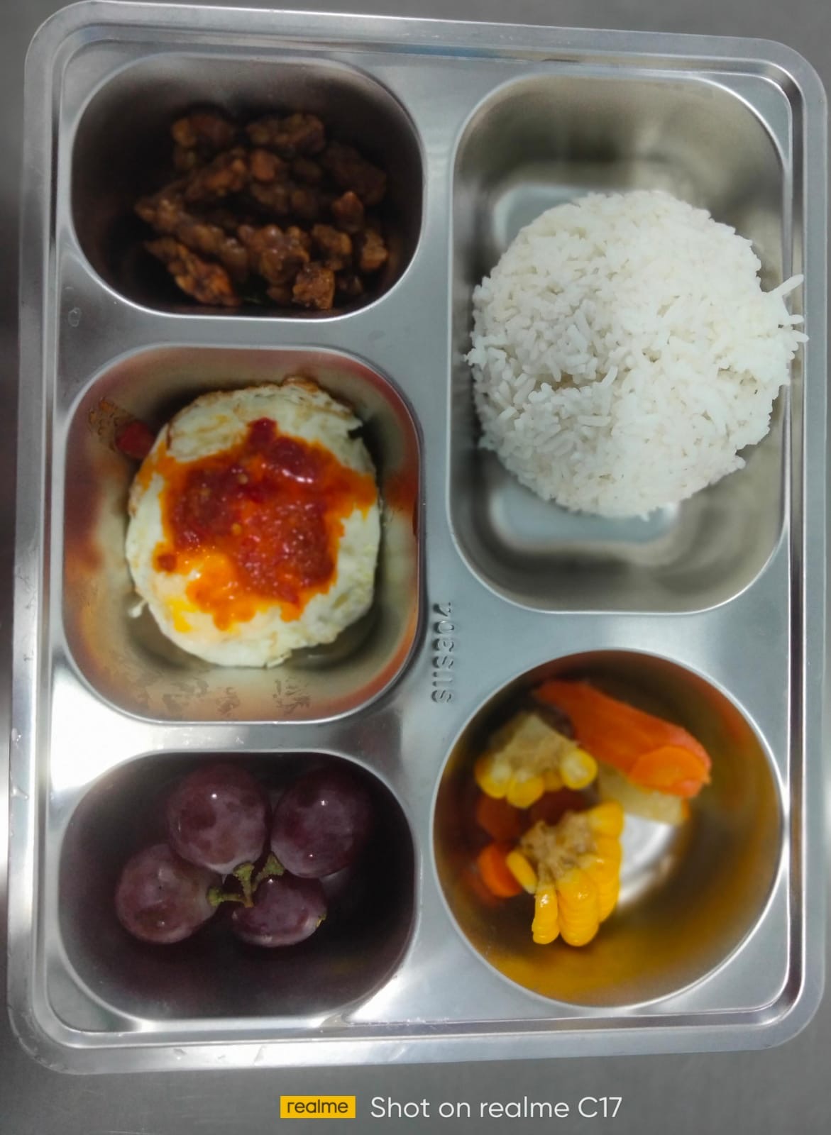 Adapun menu makanan bergizi yang dibagikan terdiri atas nasi putih, telur mata sapi sambal lado, sop sayur (wortel, labu siam, jagung), tempe oseng, dan buah-buahan segar. Untuk jenjang TK/PAUD disediakan buah anggur, sementara siswa SD hingga SMA mendapat buah jeruk.