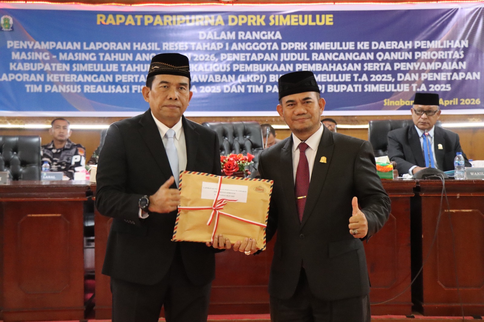 Simeulue — Dewan Perwakilan Rakyat Kabupaten (DPRK Simeulue) melaksanakan Rapat Paripurna dalam rangka penyampaian Laporan Hasil Reses Tahap I Anggota DPRK Simeulue Tahun Anggaran 2026, penetapan Judul Rancangan Qanun Prioritas Kabupaten Simeulue Tahun 2026 sekaligus pembukaan pembahasan, serta penyampaian Laporan Keterangan Pertanggungjawaban (LKPJ) Bupati Simeulue Tahun Anggaran 2025, Senin (06/04/2025).